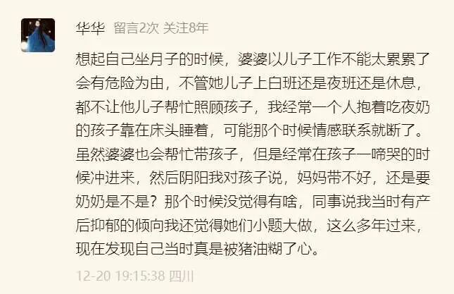 甚至有不少女性,会因为月子期间积累下来的怨恨,从此跟婆家(婆婆)形同陌路。