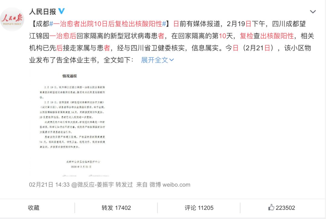 四川成都,一位治愈的患者回家隔离10天后,复检时查出核酸阳性,再一次入院。