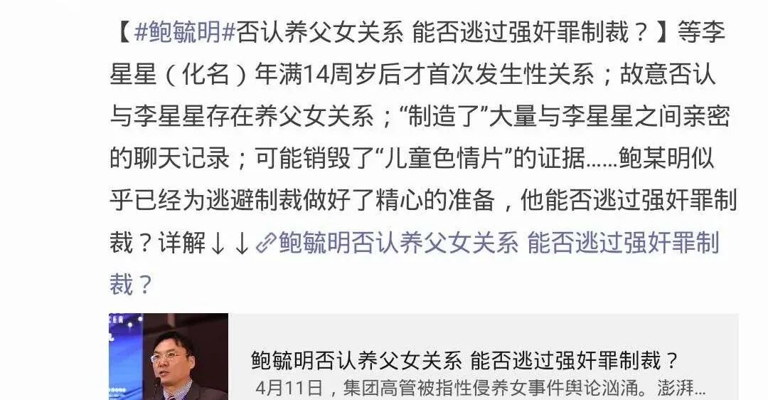 自从南风窗的《涉嫌性侵未成年女儿三年,揭开这位总裁父亲的“画皮”》爆出后,围绕“鲍毓明性侵养女案”所展开的相关报道,很快便刷爆全网。