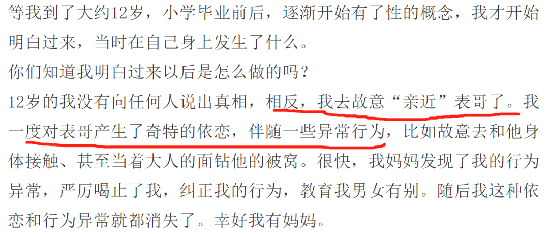 这个心理过程,也在一个勇敢说出自己曾被表哥性侵的博主(@贴着创可贴的太史毛球)得到验证。